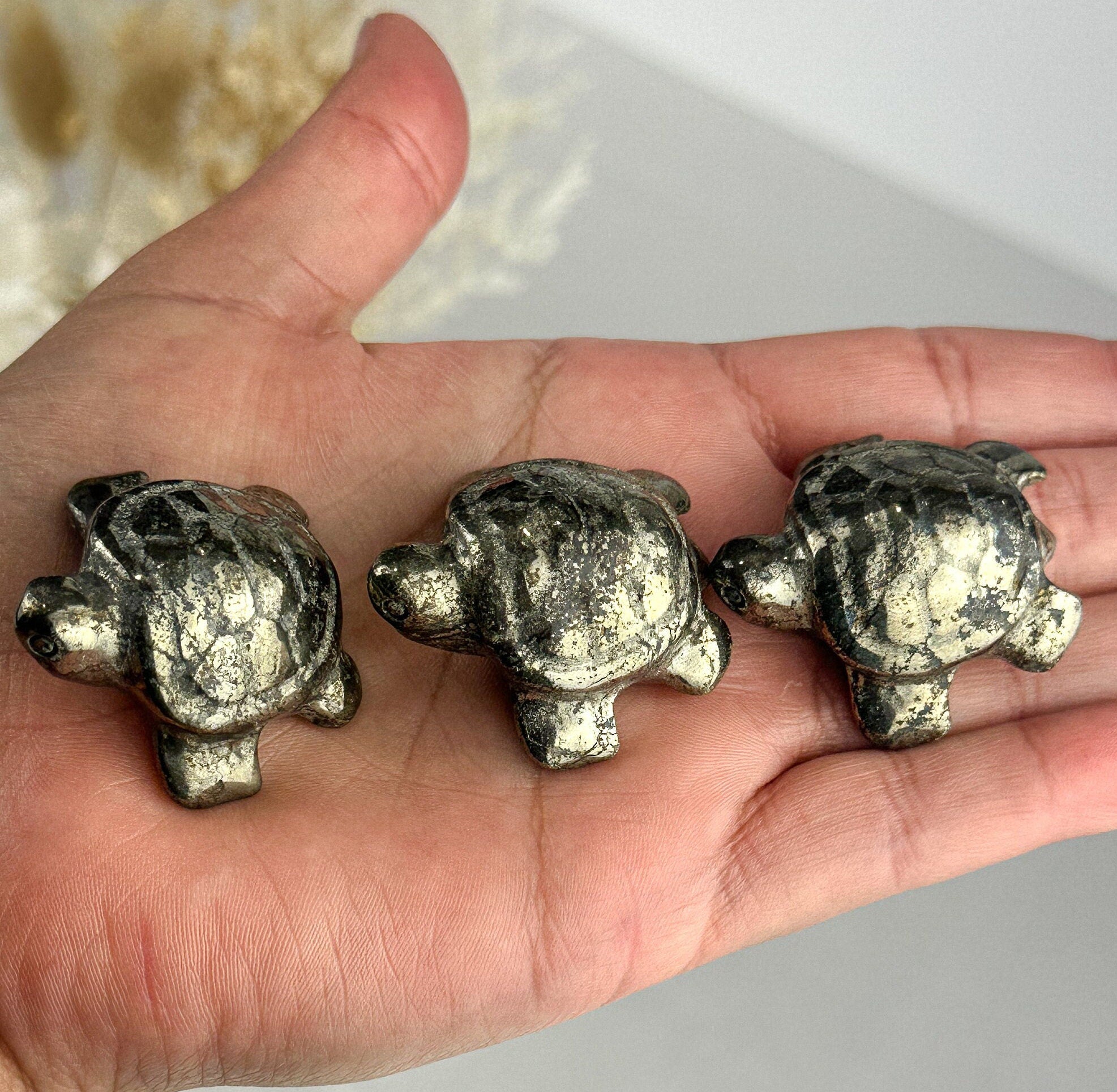 Each pyrite turtle is selected intuitively, ensuring you receive a piece with a unique energy signature. This captivating carving is perfect for your desk, pocket, or crystal grid.