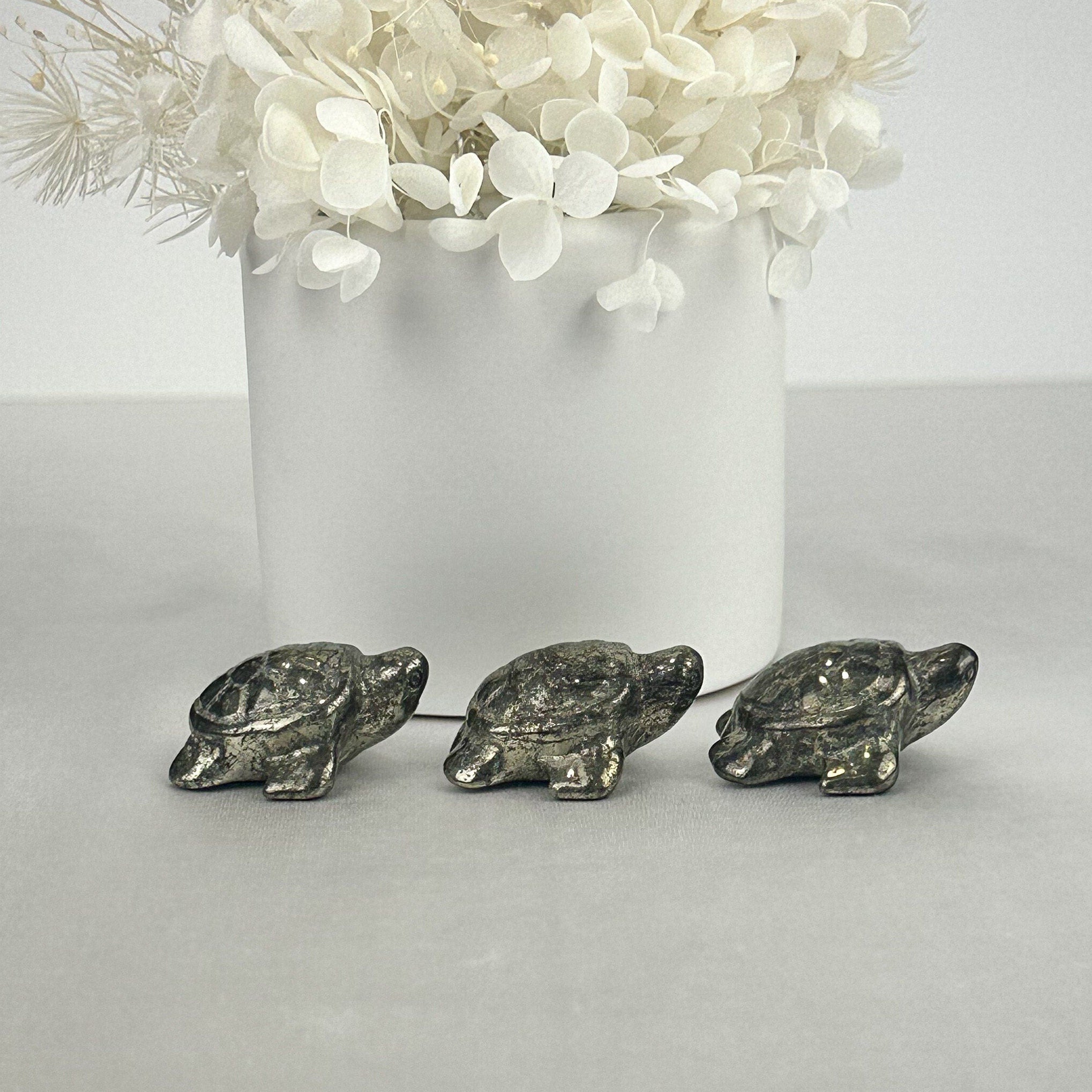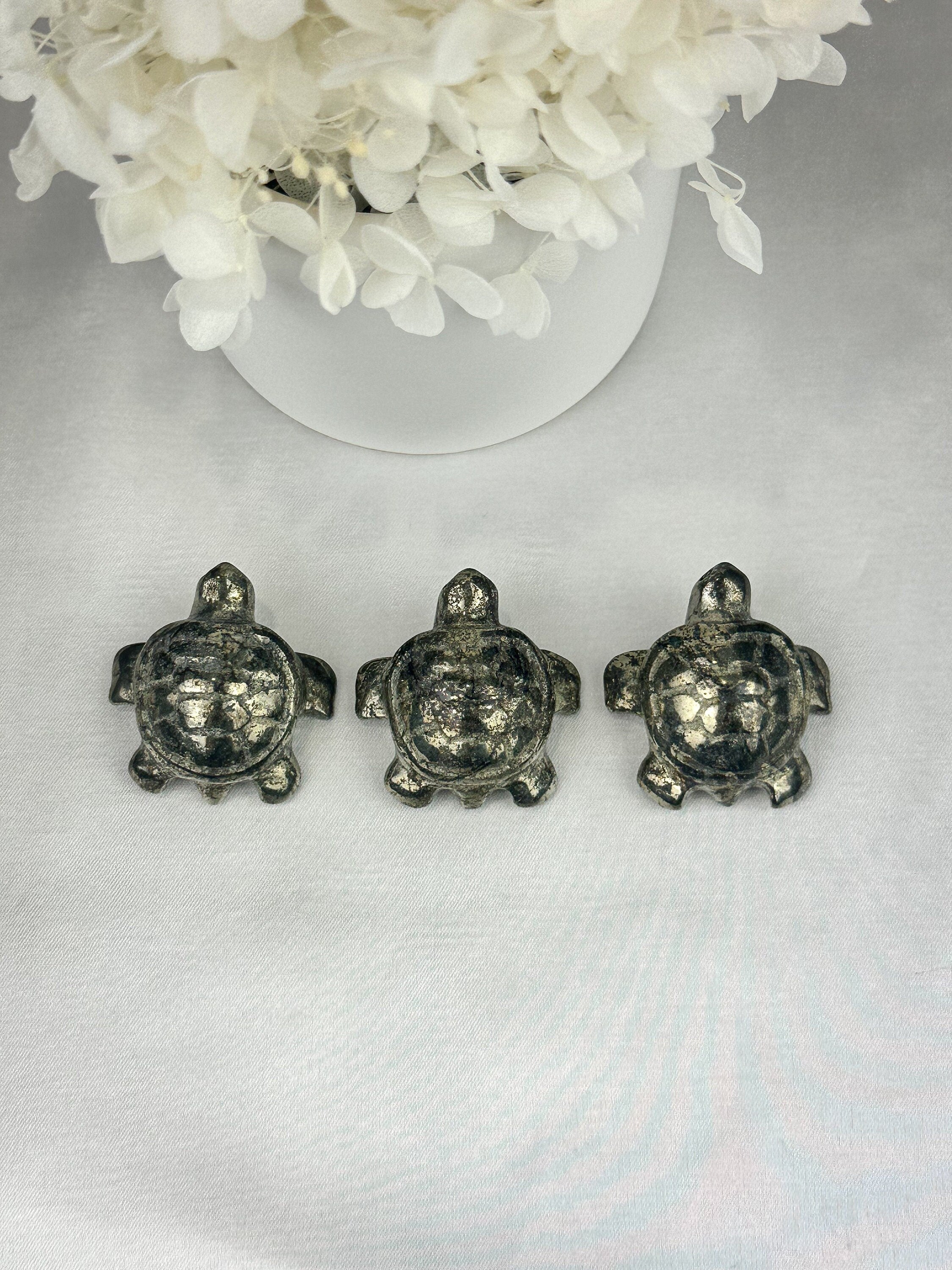 Pyrite, often referred to as "Fool's Gold," resonates with powerful energies that attract wealth, prosperity, and good fortune. The presence of this small pyrite turtle can infuse your space with positive vibrations and create an atmosphere of success.