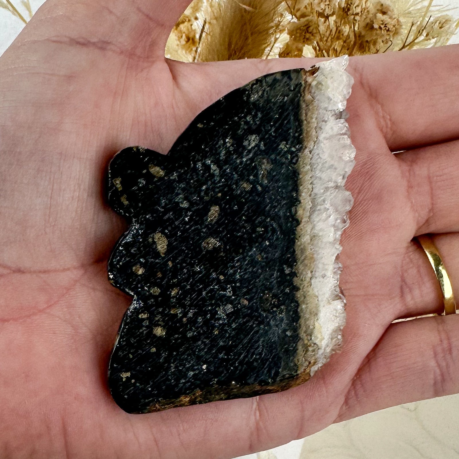 Quartz druzy is known for its ability to radiate light and positive energy, bringing balance and harmony to the wearer. This fairy, adorned with quartz druzy wings, embodies the essence of spiritual growth and connection to higher realms, making it a cherished piece for crystal enthusiasts.