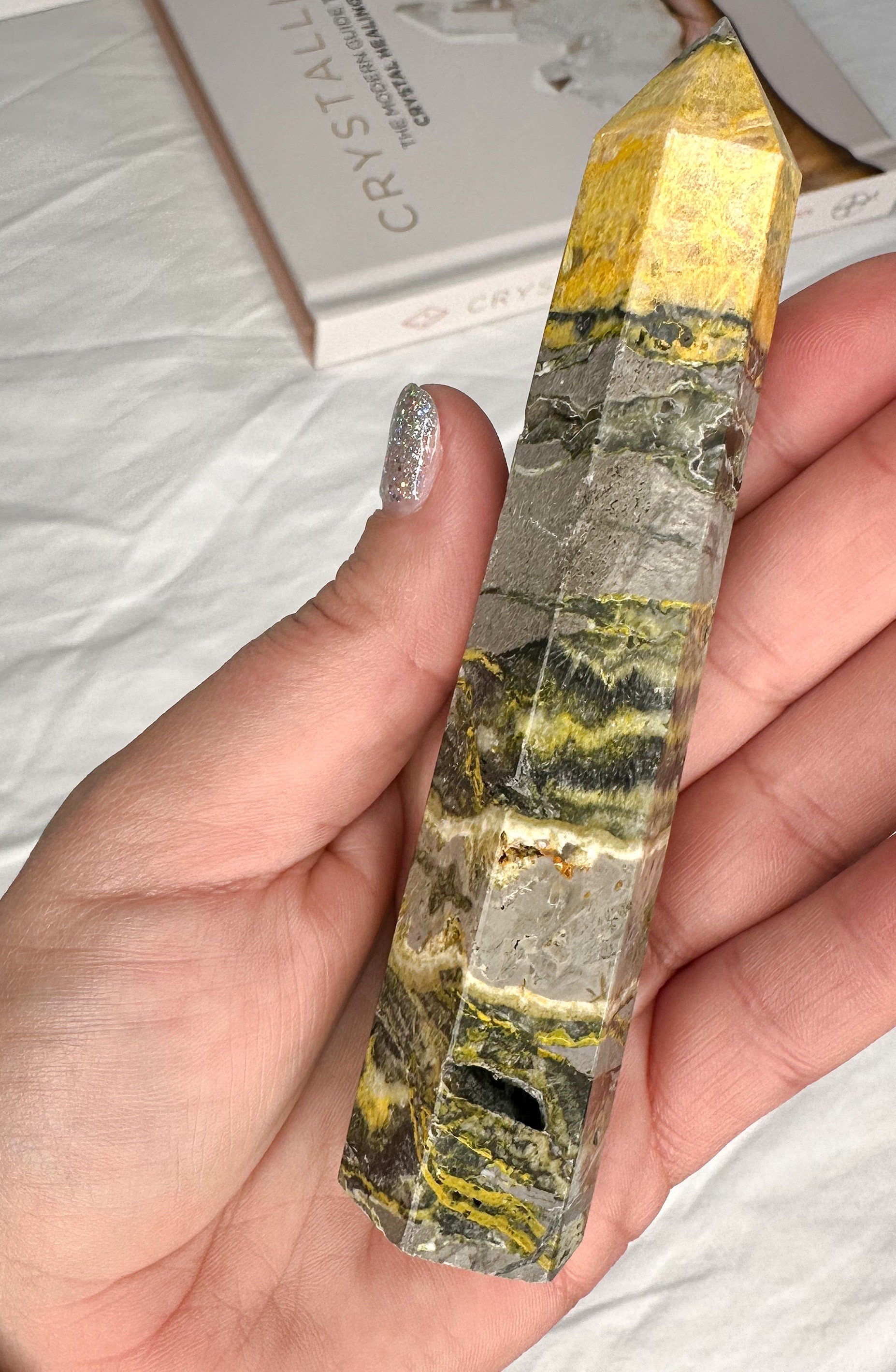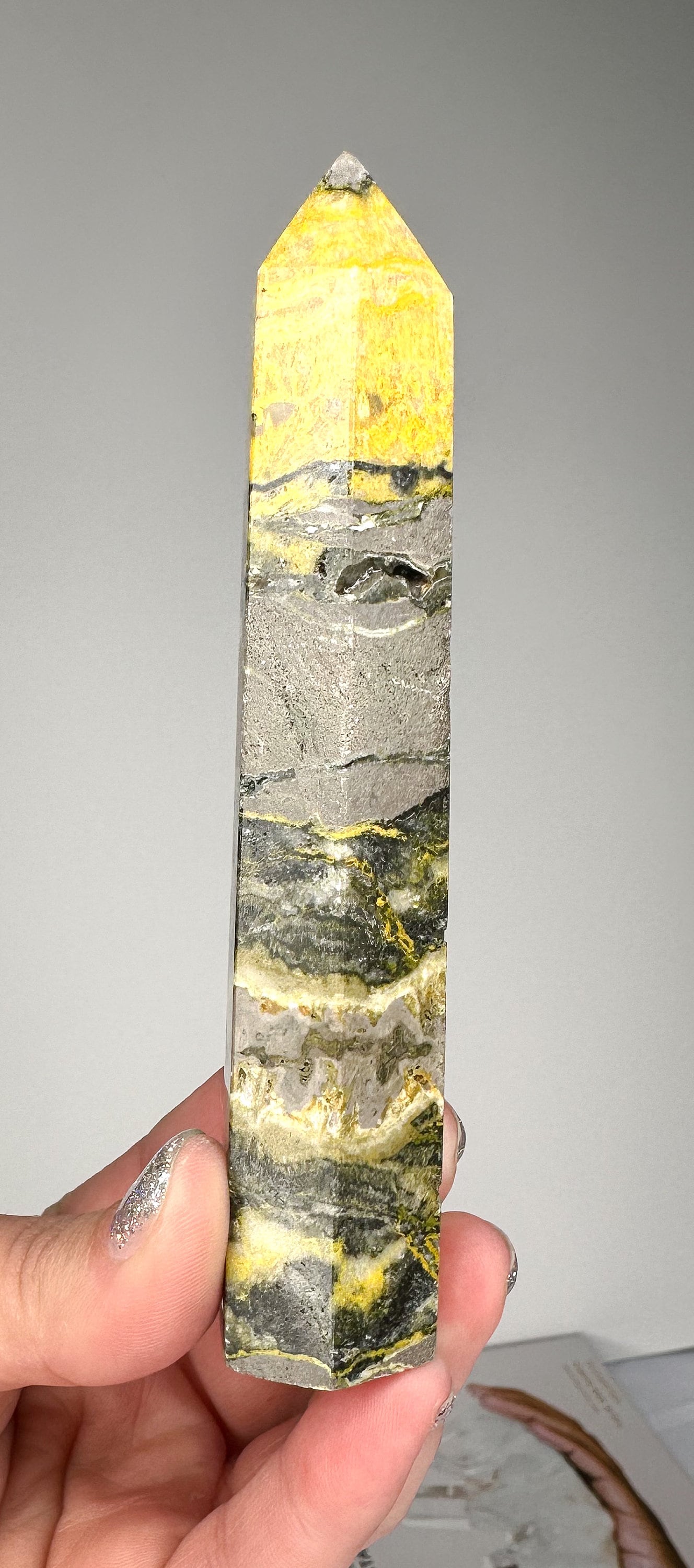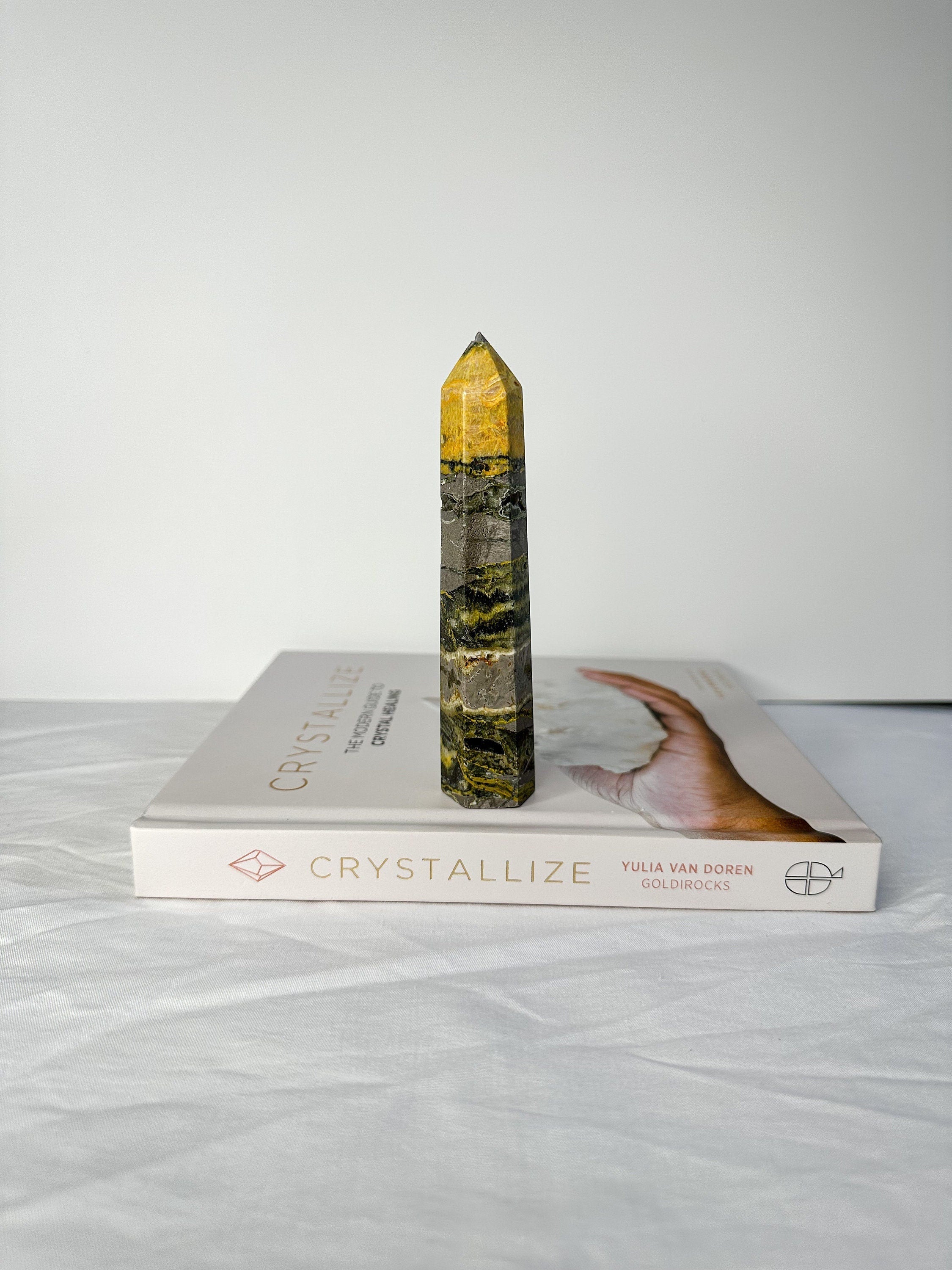 Beautiful high quality bumblebee jasper tower with druzy pocket.