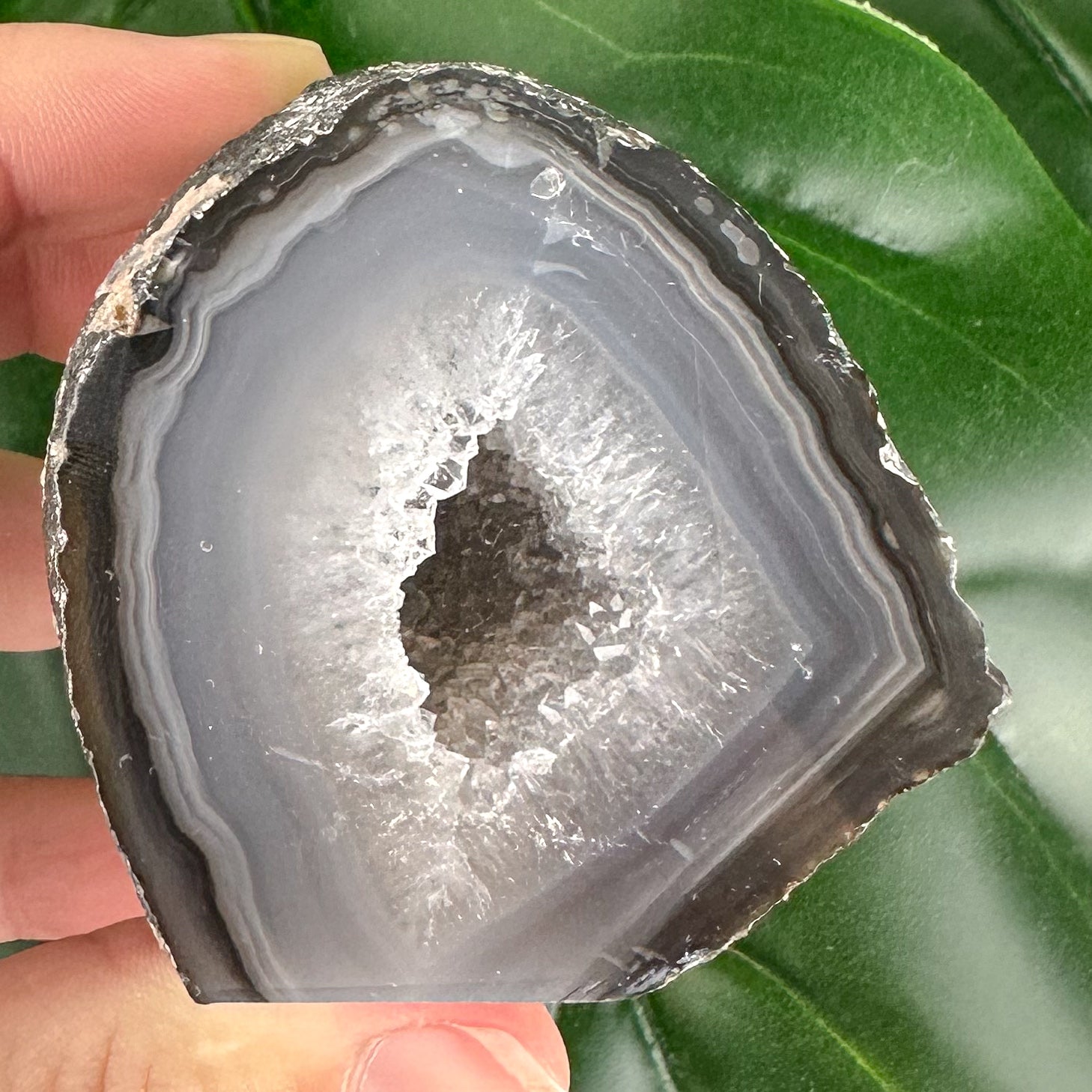 This elegant agate slice holds subtle smoky-grey tones with a glowing central druzy cavity, softly polished to reveal nature’s magic. A calming and grounding piece, this slice encourages emotional clarity and gentle self-reflection. Beautiful on a desk, bedside table, or altar space to keep your energy clear and peaceful.