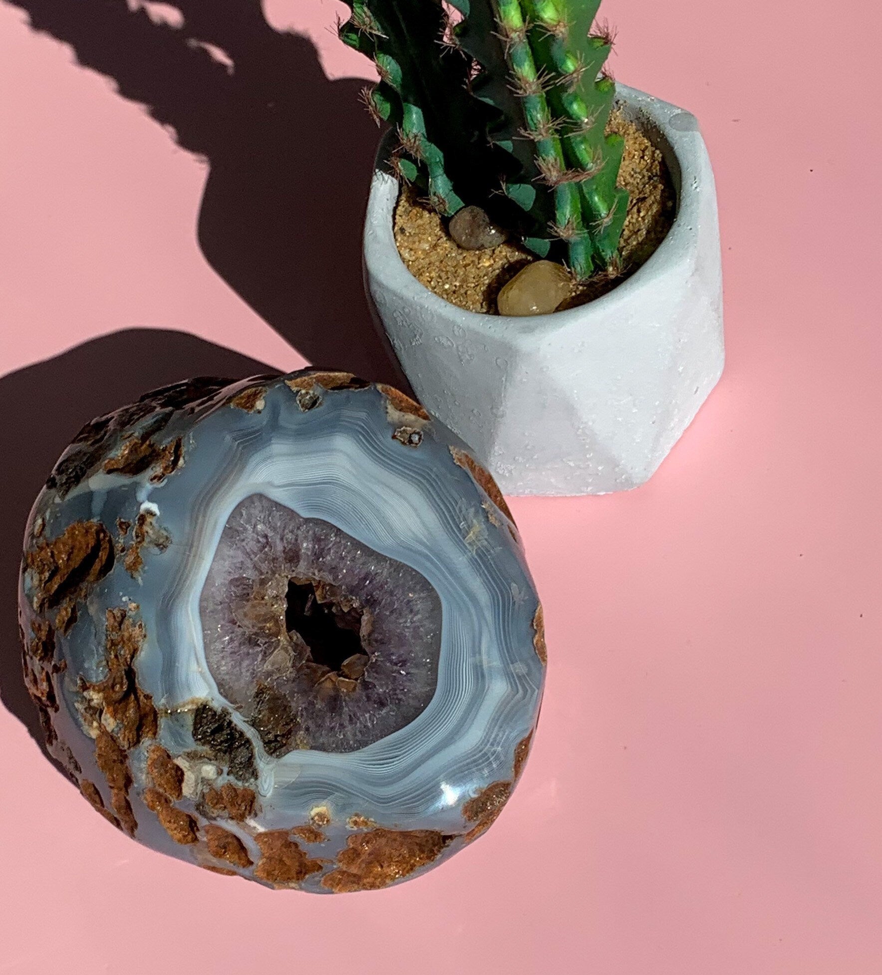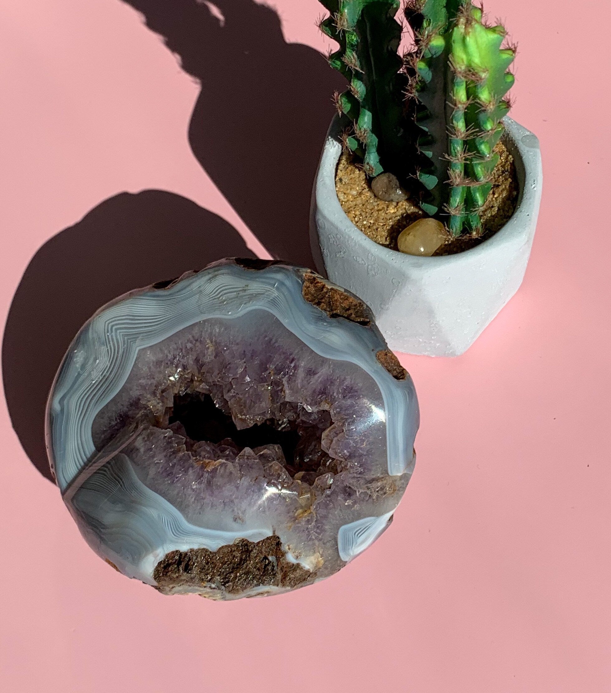 Beautiful purple amethyst cluster with natural sides. This piece is very unique and definitely is a beautiful statement piece for any house or office.