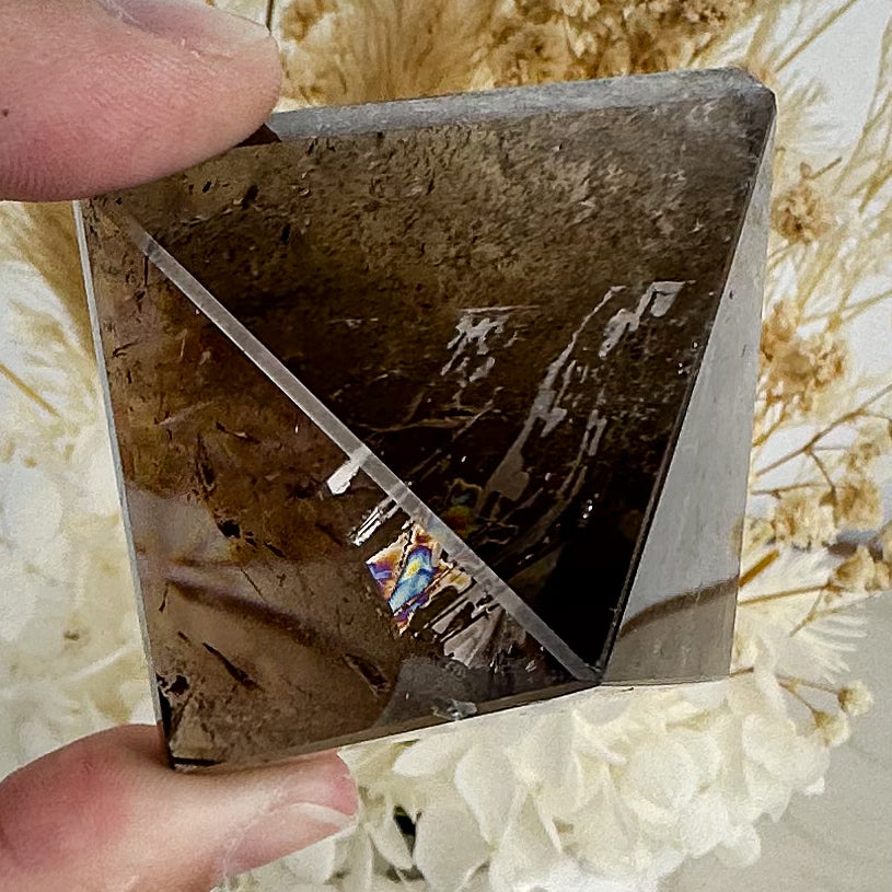 Admire its deep, earthy hues and be captivated by the radiant rainbows that shimmer within. Ideal for meditation and energy grounding, this pyramid resonates with serene, protective energies.