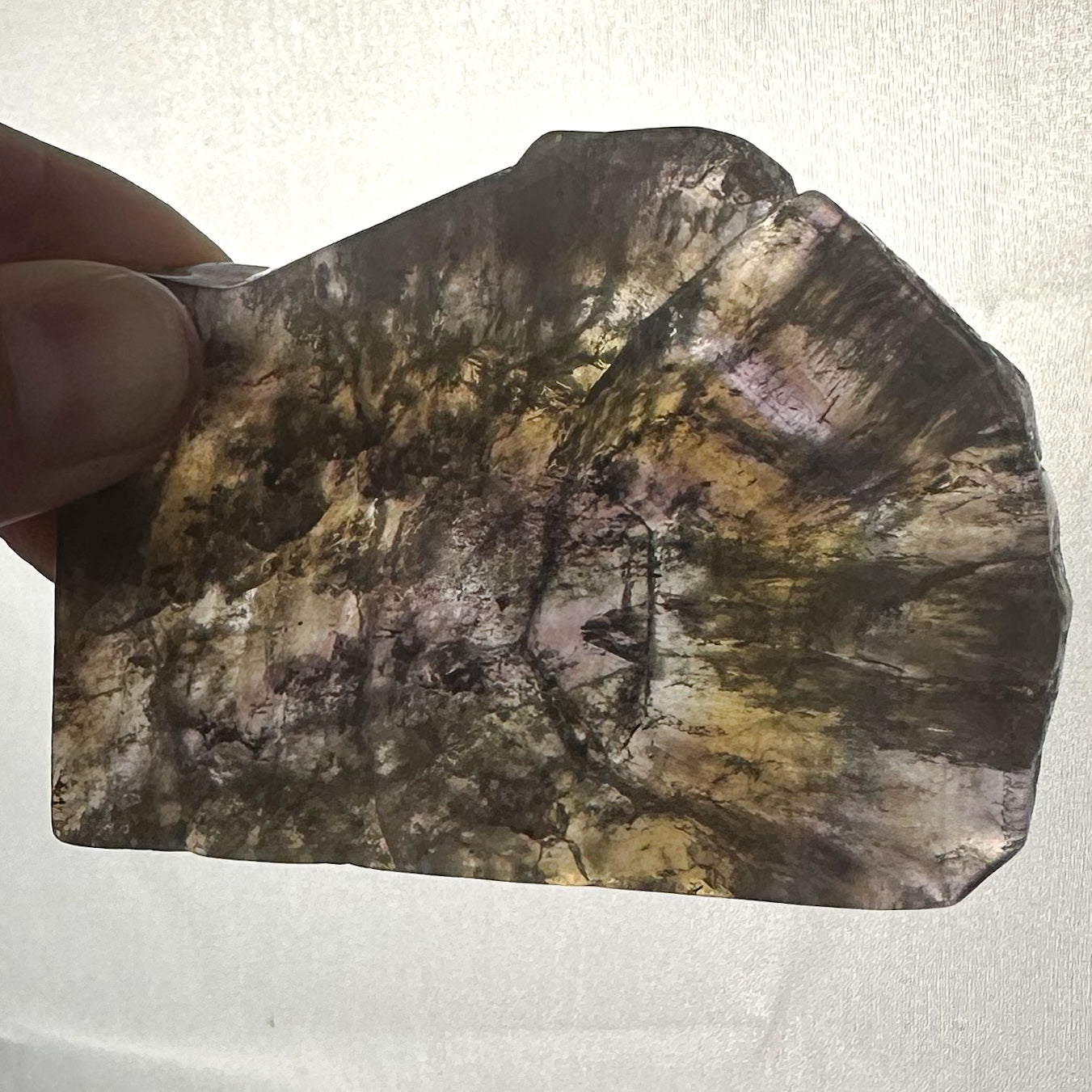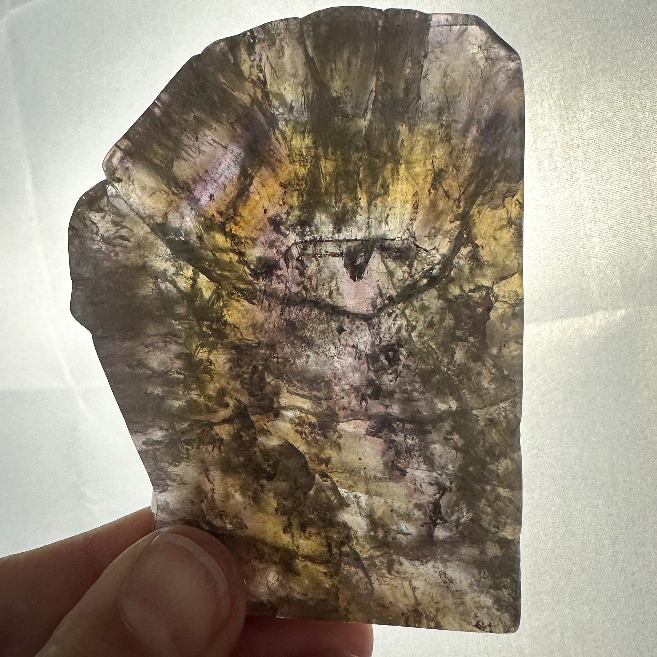 Discover the beauty and unique energy of this Super Seven slab. Weighing approximately 71 grams and measuring about 7.5x5.5x0.8 cm, this exquisite piece has polished front and back faces and showcases a stunning rainbow inside. This piece is one-of-a-kind, and you will receive the exact slab shown.