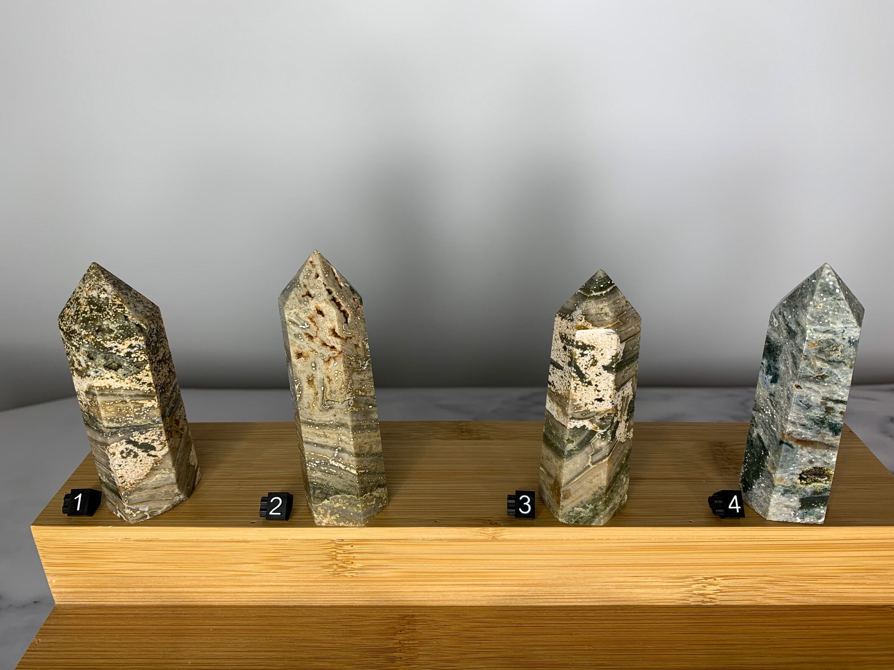 These ocean jasper towers towers all vary slightly in colour, weight and crystal size. Most of them have druzy or geodes.