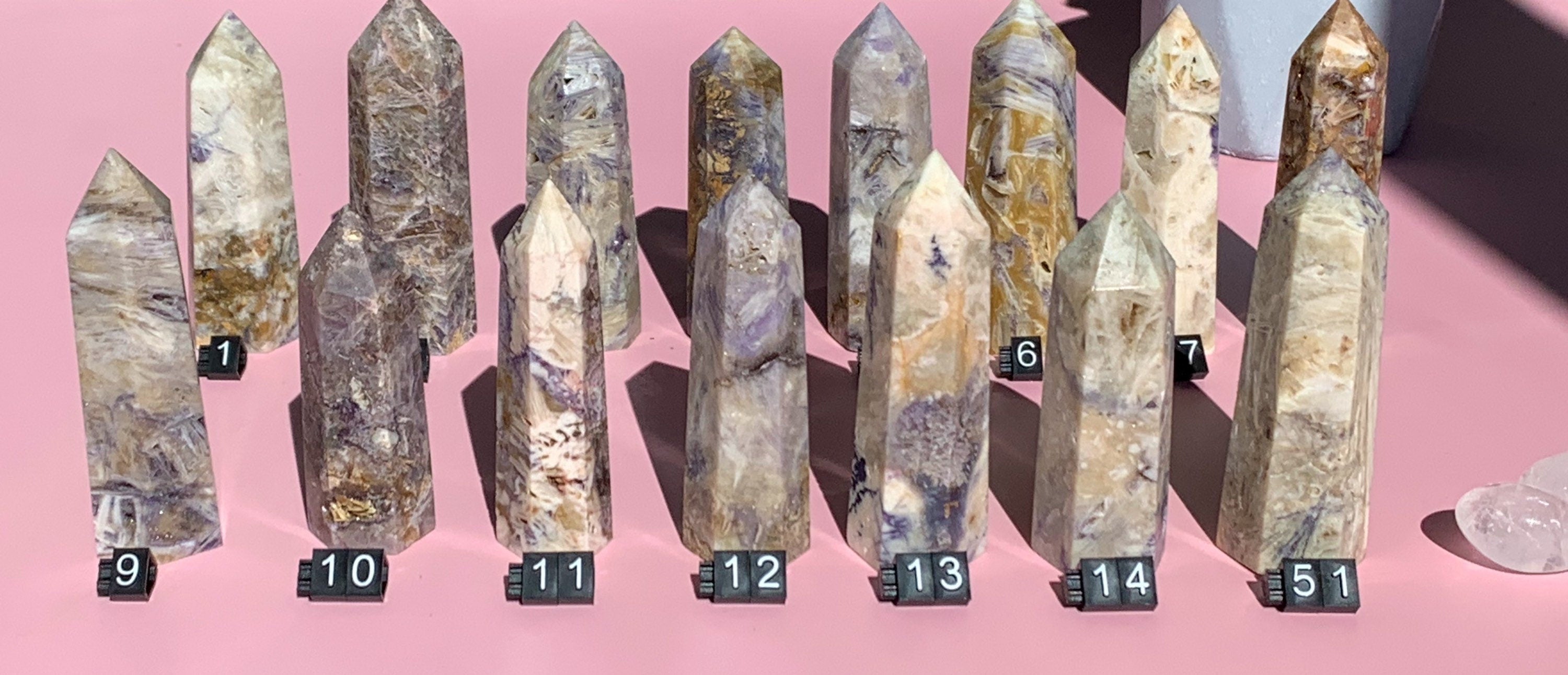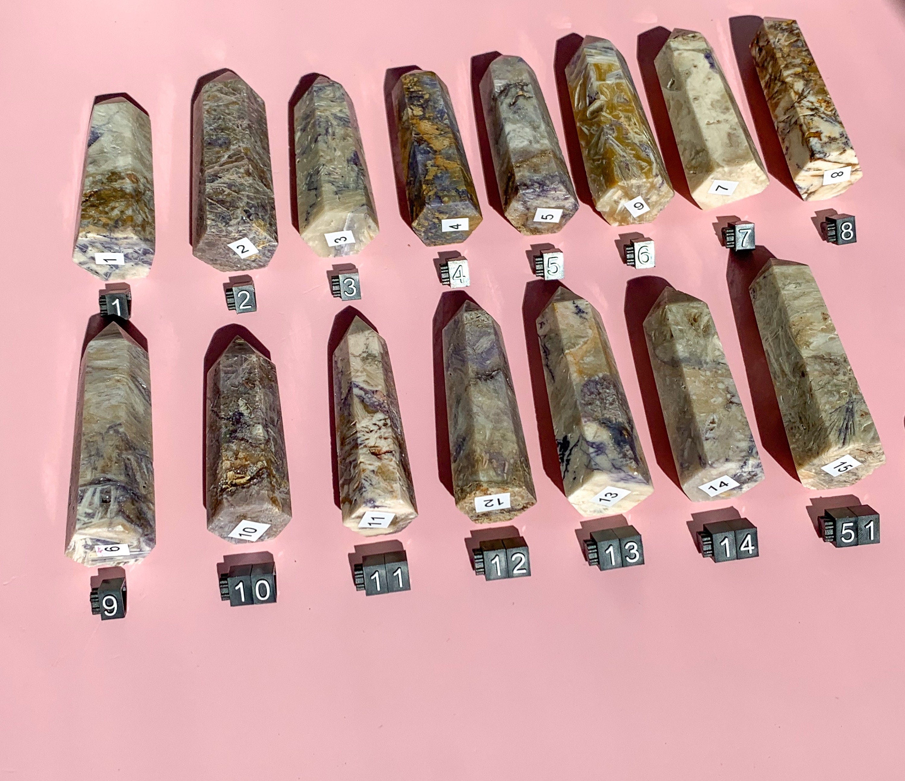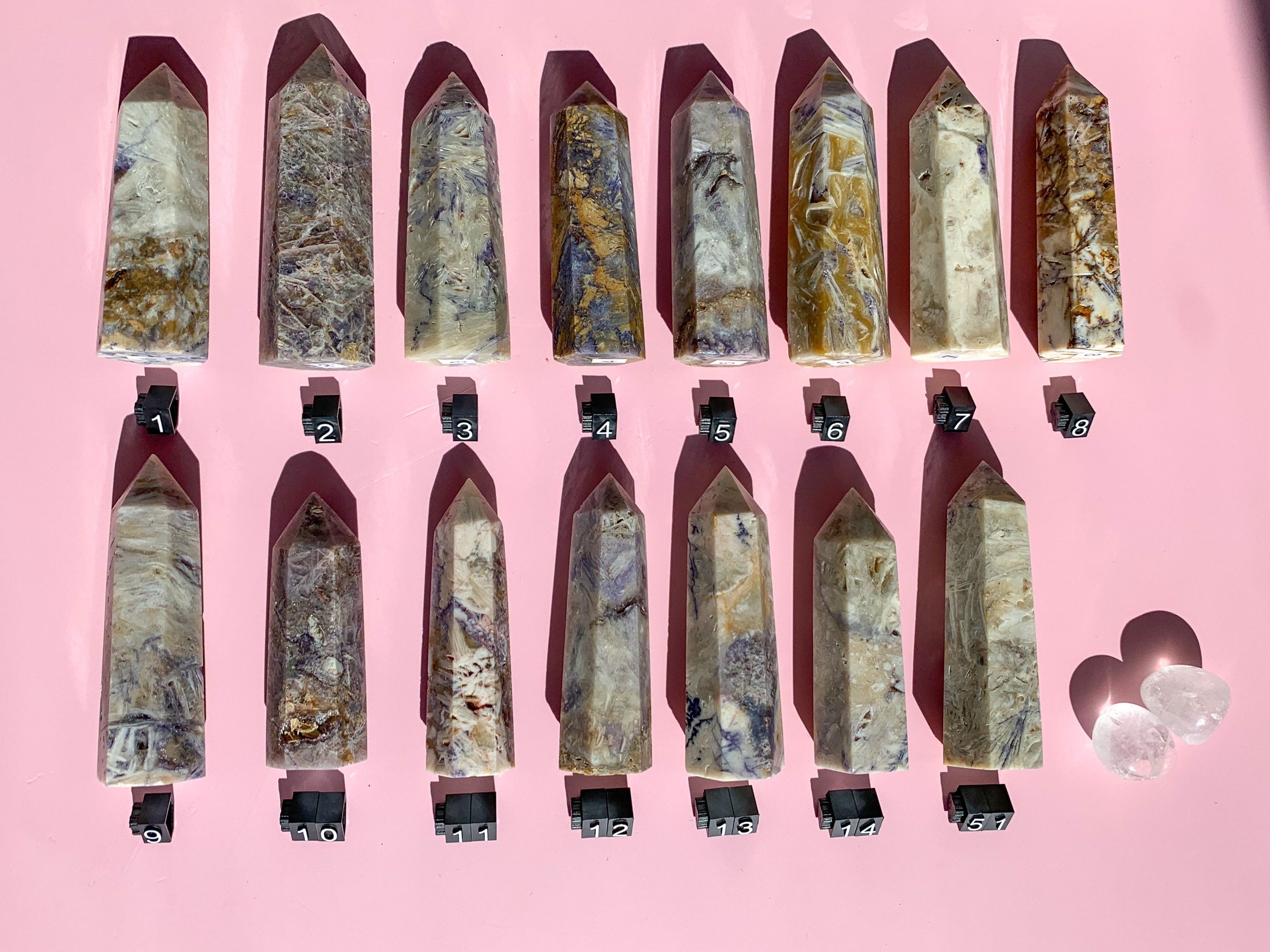 Beautiful violet jasper crystal tower most with blue druzy pockets and sparkly.