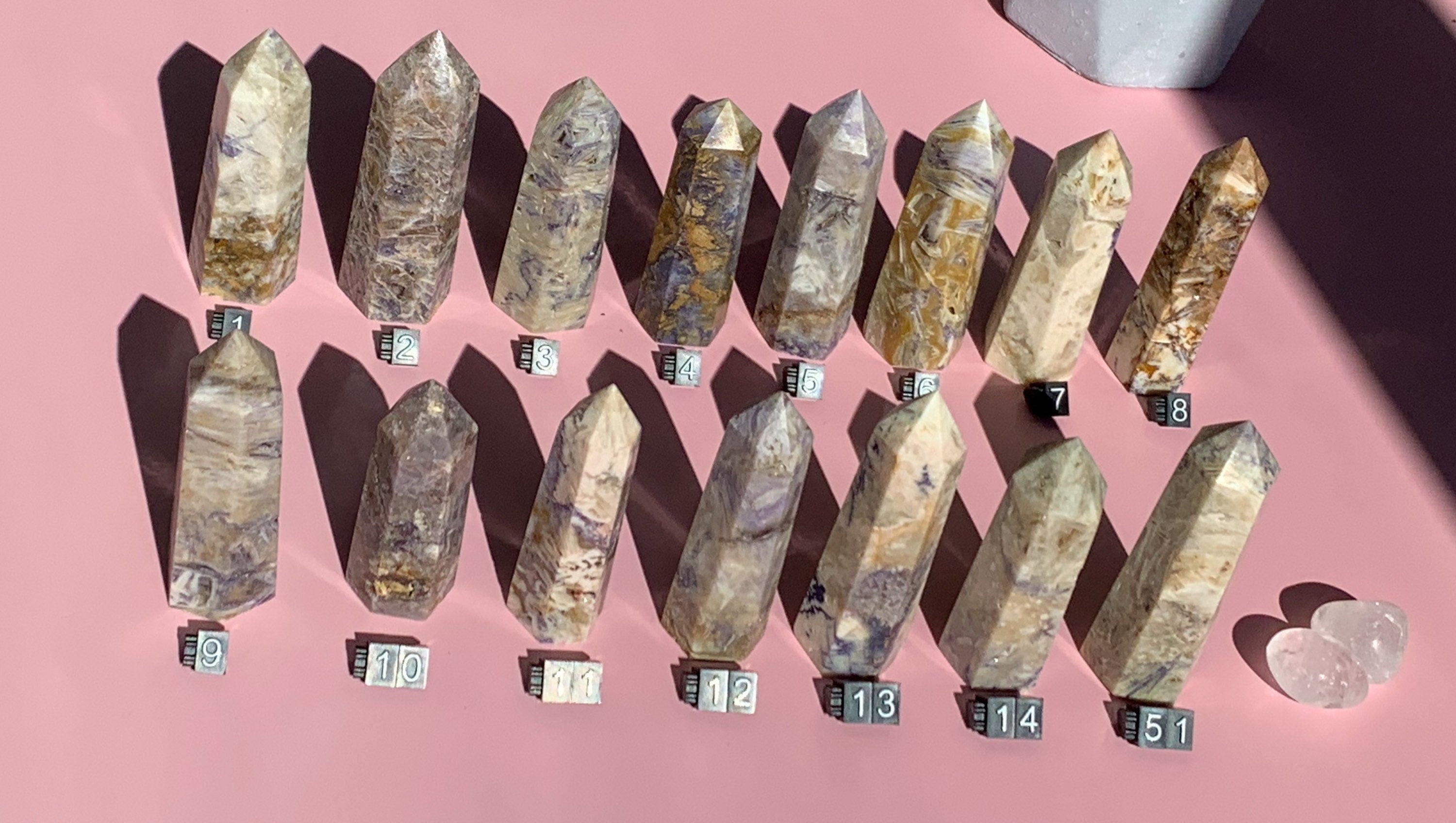 These violet crystal towers all vary slightly in colour, weight and crystal size.