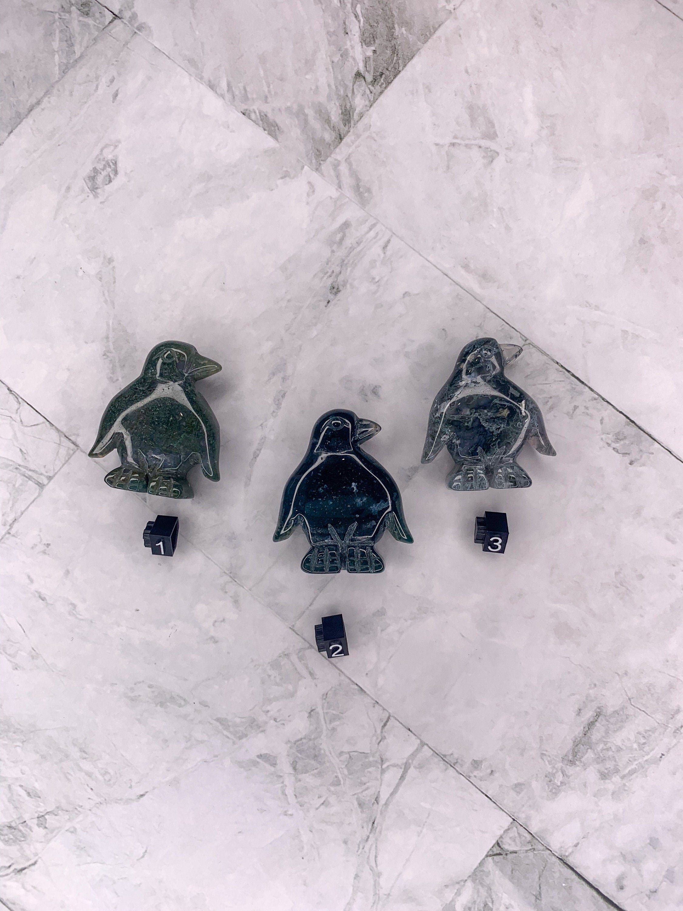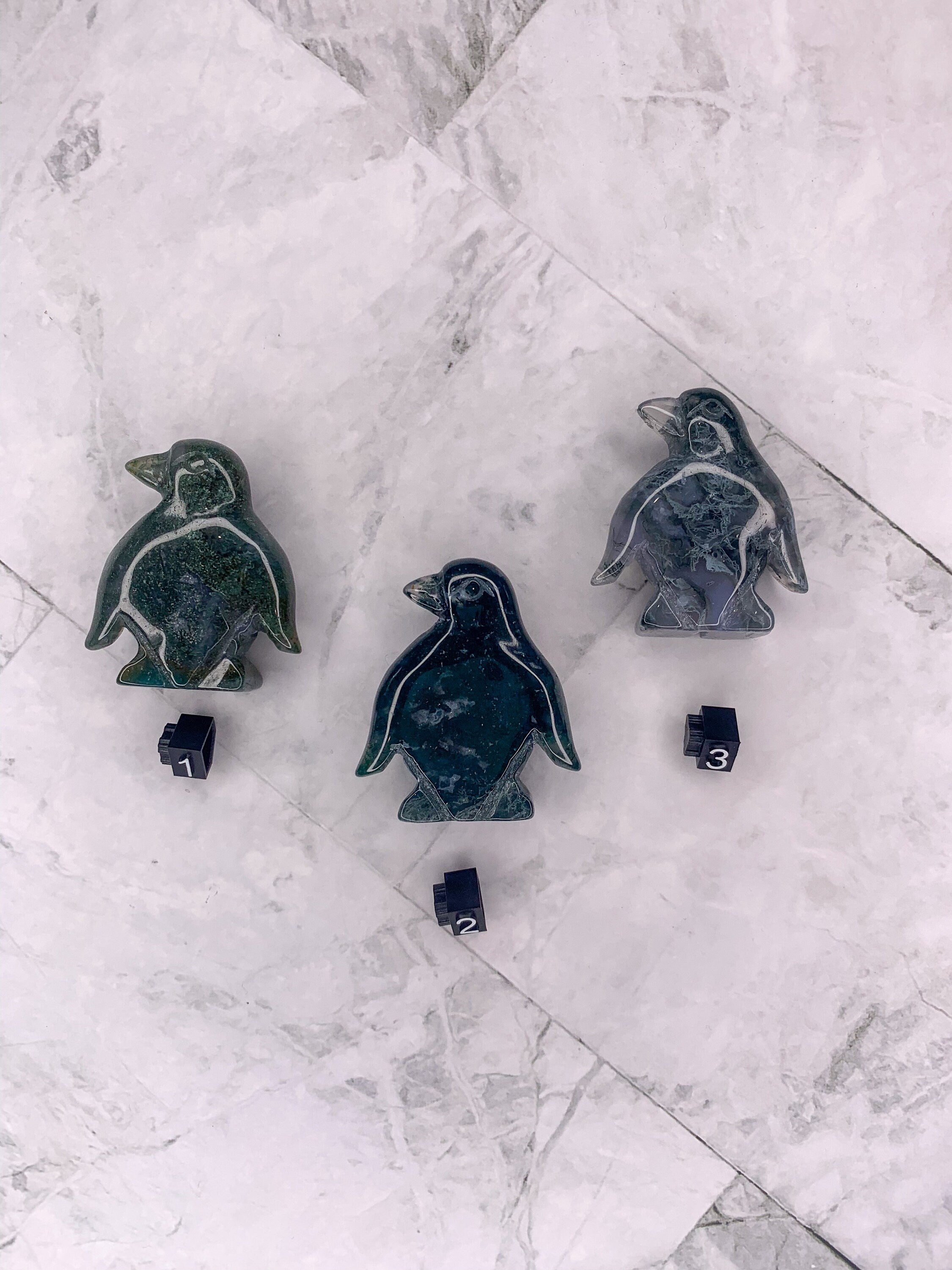 These moss agate penguins vary slightly in colour, weight and crystal size.